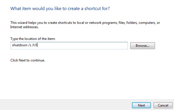shutdown /s /t 0Click Next, and name the shortcut as Shut Down (or anything you like).