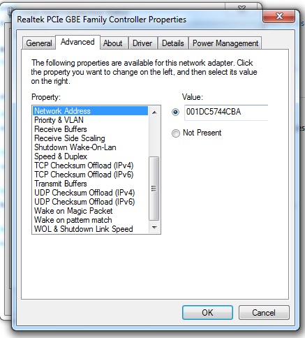 Go to : Control Panel\Network and Internet\Network and Sharing Center Click on Local Area Connection Status < Properties < Your Network Device (Realtek PCIe GBE Family Controller) < Configure < Advance Then Scroll down to Network Address