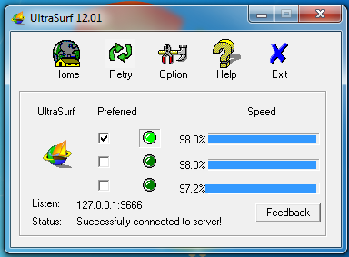 You just run the file named; u1201.exe for ultrasurf A window will appear and it will connect to a proxy server automatically. A light green button will show which serevr you are connected right now. You can also switch your proxy server by clicking on another check box for server. You can also see the proxy server strength. You have to check the maximum strength proxy server for quicker browsing anonymously.